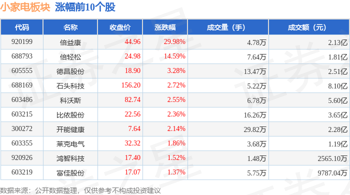 | 代码 | 名称 | 收盘价 | 涨跌幅 | 成交量(手) | 成交额(元) | | --- | --- | --- | --- | --- | --- | | 6610Z6 | 倍益康 | 58.44 | 29.98% | 3.43万 | 2.00亿 | | 688169 | 石头科技 | 161.29 | 3.26% | 6.39万 | 10.16亿 | | 603219 | 富佳股份 | 17.57 | 2.93% | 8.52万 | 1.48亿 | | 605555 | 德昌股份 | 19.45 | 2.91% | 20.28万 | 3.91亿 | | 920926 | 鸡智科技 | 17.70 | 1.72% | 1.16万 | 2034.98万 | | 002403 | 爰仕达 | 12.80 | 1.67% | 6.24万 | 7963.88万 | | 002959 | 小能电器 | 43.15 | 1.10% | 1.90万 | 8143.64万 | | 003023 | 彩虹集团 | 22.85 | 1.06% | 2.36万 | 5418.67万 | | 603486 | 科沃斯 | 8 ...