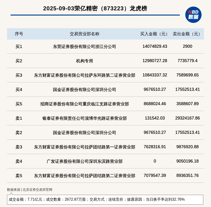 | | 2025-09-03荣亿精密 (873223) 龙虎榜 | | | | --- | --- | --- | --- | | 序号 | 交易营业部名称 | 买入金额(元) | 实出金额(元) | | ポリ | 东莞证券股份有限公司浙江分公司 | 14074829.43 | 2900 | | 买2 | 机构专用 | 12980727.28 | 7735779.4 | | 址3 | 东方财富证券股份有限公司拉萨东环路第二证券营业部 | 10843337.32 | 7589699.65 | | द्र 4 | 国金证券股份有限公司深圳分公司 | 9676510.27 | 17552513.41 | | ન્નેર | 招商证券股份有限公司重庆临江支路证券营业部 | 8688024.46 | 3588607.89 | | 卖1 | 银泰证券有限责任公司淄博华光路证券营业部 | 131542.03 | 29324167.86 | | 卖2 | 国金证券股份有限公司深圳分公司 | 9676510.27 | 17552513.41 | | 卖3 | 东方财富证券股份有限公司拉萨团结路第一证券营业部 | 7628316 ...