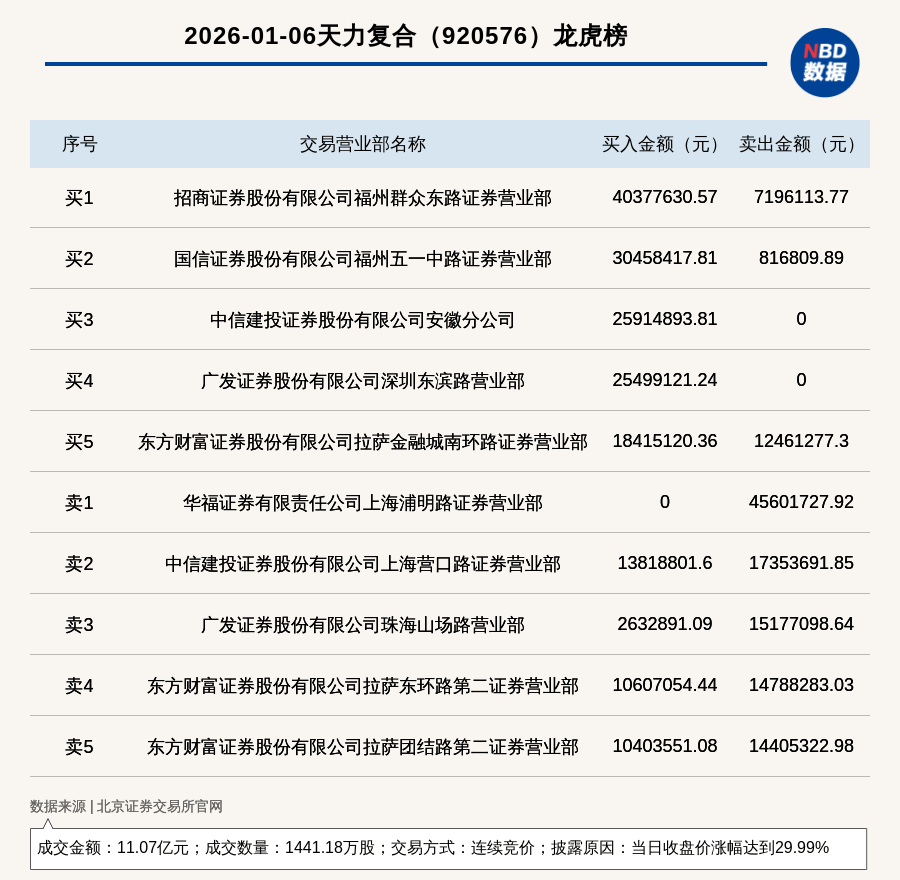 公司股价异动 - 2026年1月6日,北交所上市公司天力复合(920576)收盘价涨幅达到29.99% [1] - 当日成交数量为1441.18万股,成交金额为11.07亿元 [1] - 交易方式为连续竞价 [1] 龙虎榜交易详情 - 买入金额最高的席位为招商证券股份有限公司福州群众东路证券营业部,买入4037.76万元 [1][2] - 卖出金额最高的席位为华福证券有限责任公司上海浦明路证券营业部,卖出4560.17万元 [1][2] - 买入前五席位合计买入金额超过1.4亿元,卖出前五席位合计卖出金额超过1.07亿元 [2]