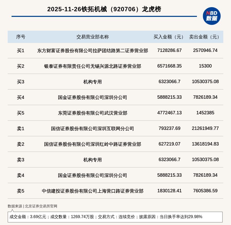 公司龙虎榜交易概况 - 铁拓机械于2025年11月26日登上北交所龙虎榜,披露原因为当日换手率达到29.98% [1] - 当日成交数量为1269.74万股,成交金额为3.69亿元 [1] - 交易方式为连续竞价 [1] 买卖席位及金额详情 - 买入金额排名第一的席位为东方财富证券股份有限公司拉萨团结路第二证券营业部,买入金额为712.83万元 [1] - 卖出金额排名第一的席位为国信证券股份有限公司深圳互联网分公司,卖出金额为2126.19万元 [1] - 龙虎榜数据显示,机构专用席位同时出现在买3和卖3位置,买入632.31万元,卖出1053.04万元 [2] - 国金证券股份有限公司深圳分公司同时出现在买4和卖4位置,买入588.82万元,卖出782.62万元 [2] - 卖2席位为国信证券股份有限公司深圳红岭中路证券营业部,卖出1361.82万元 [2]