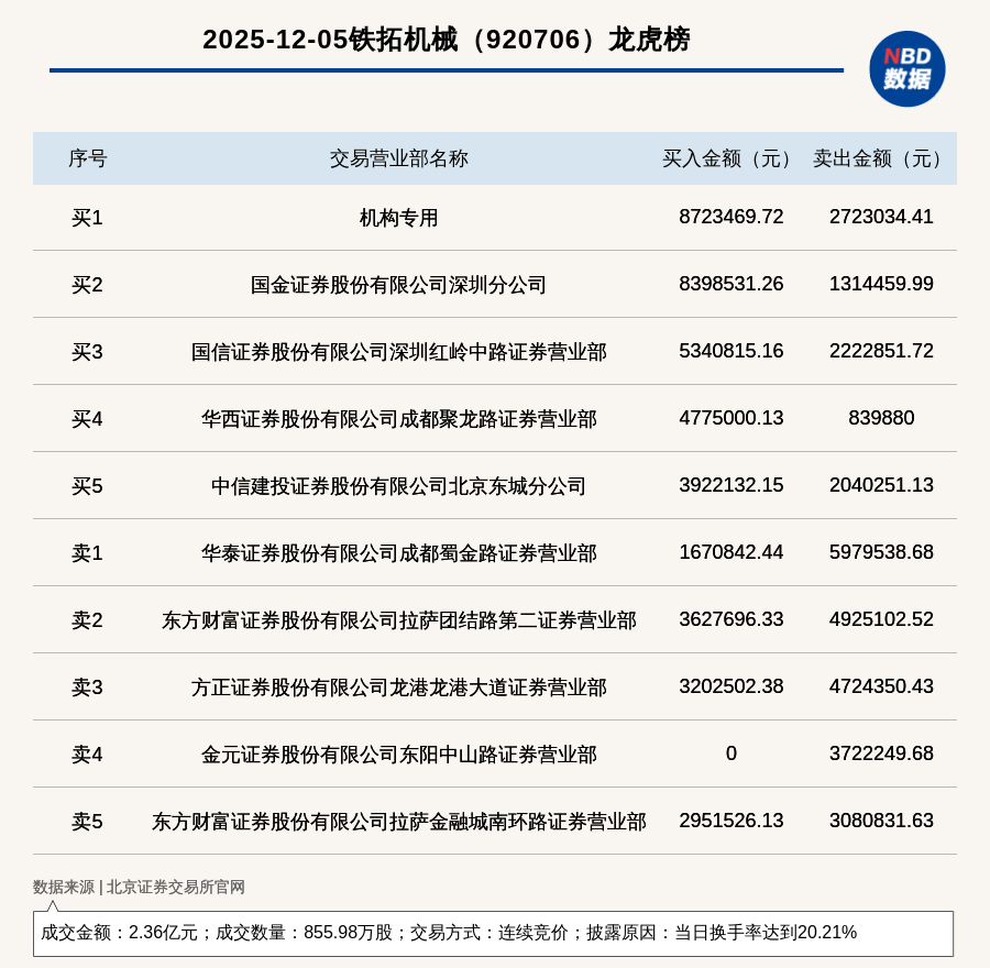 龙虎榜交易概况 - 铁拓机械于2025年12月5日登上北交所龙虎榜 交易方式为连续竞价 披露原因是当日换手率达到20.21% [1] - 当日成交数量为855.98万股 成交金额为2.36亿元 [1] - 收盘价为27.95元 [1] 买卖席位分析 - 买入前五席位合计买入金额约为3116万元 其中买一席位为机构专用 买入872.35万元 [1][2] - 卖出前五席位合计卖出金额约为2243万元 其中卖一席位为华泰证券股份有限公司成都蜀金路证券营业部 卖出597.95万元 [1][2] - 机构专用席位在买入872.35万元的同时 也卖出了272.30万元 [2] - 买入金额排名第二的为国金证券股份有限公司深圳分公司 买入839.85万元 [2] - 卖出金额排名第二的为东方财富证券股份有限公司拉萨团结路第二证券营业部 卖出492.51万元 [2]