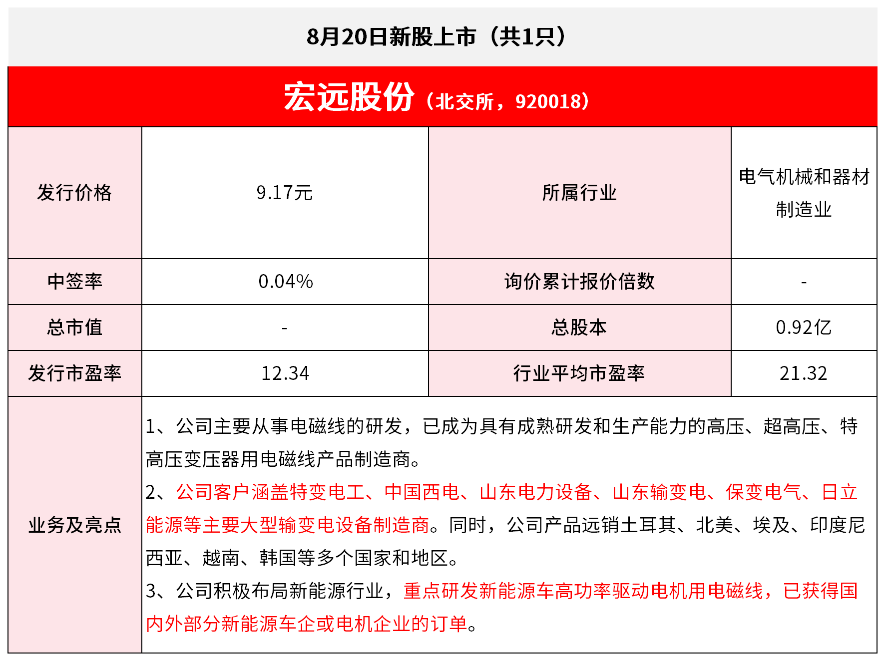 (文章来源:每日经济新闻) 每经AI快讯,8月20日,今日无新股申购,有1只新股上市,为北交所的宏远股份。 ...