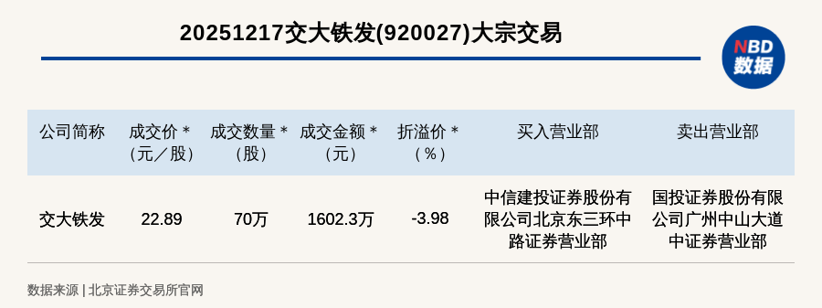 免责声明:本文内容与数据仅供参考,不构成投资建议,使用前核实。据此操作,风险自担。 每日经济新闻 (记者 张明双) 每经讯,2025年12月24日,北交所上市公司交大铁发(920027,收盘价:22.6元)发生一笔大宗交易,成交价21.7元/股,成交 数量40万股,成交金额868万元,折价3.98%。买入营业部是国泰海通证券股份有限公司上海临港新片区分公司,卖出营业部是 国投证券股份有限公司广州中山大道中证券营业部。 ...