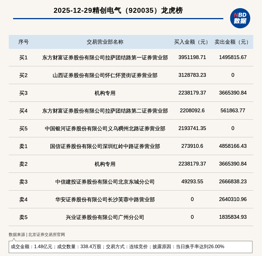 每经讯,2025年12月29日,北交所上市公司精创电气(920035,收盘价:44.75元)登上龙虎榜,交易方式是连续竞价,披露原 因是当日换手率达到26.00%,成交数量338.4万股,成交金额1.48亿元。买一席位为东方财富证券股份有限公司拉萨团结路第一 证券营业部,买入395.12万元;卖一席位为国信证券股份有限公司深圳红岭中路证券营业部,卖出485.82万元。 免责声明:本文内容与数据仅供参考,不构成投资建议,使用前核实。据此操作,风险自担。 | | 2025-12-29精创电气 (920035) 龙虎榜 | | | | --- | --- | --- | --- | | 序号 | 交易营业部名称 | 买入金额(元) | 卖出金额(元) | | ਜੇਵ ਹ | 东方财富证券股份有限公司拉萨团结路第一证券营业部 | 3951198.71 | 1495815.67 | | 买2 | 山西证券股份有限公司怀仁怀贤街证券营业部 | 3128783.23 | 0 | | 址3 | 机构专用 | 2238179.37 | 3665390.84 | | ग्रेन | 东方财富证券股份有限公司拉萨团结路第二证券营业 ...