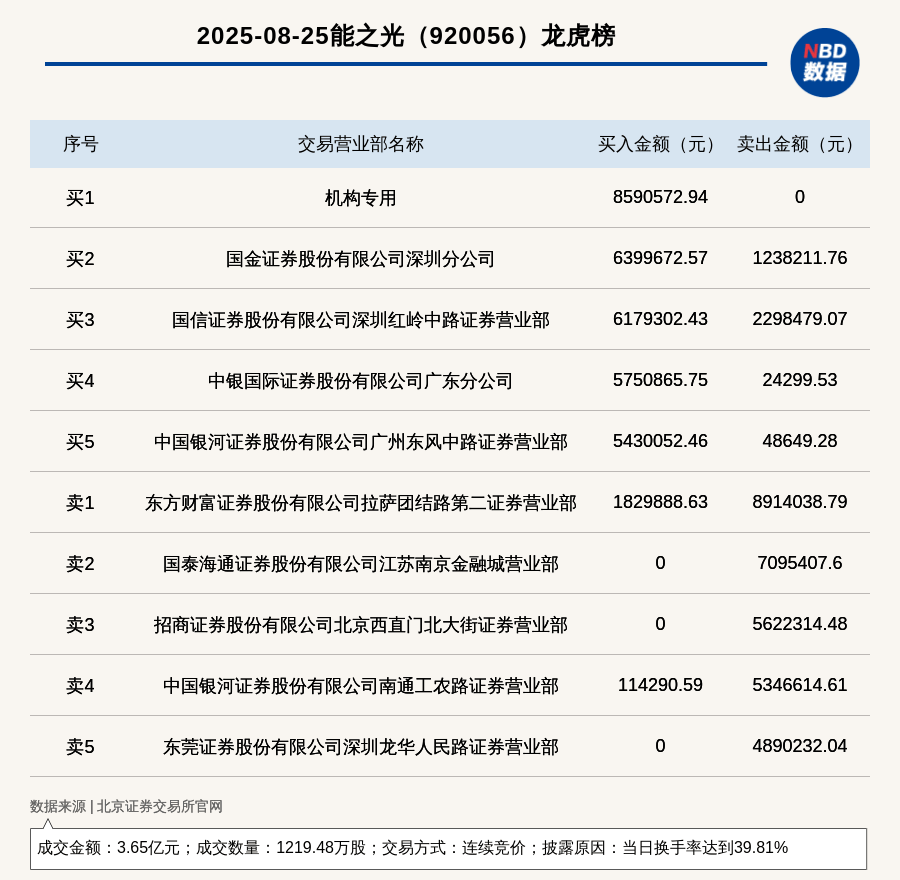 交易概况 - 北交所上市公司能之光因当日换手率达到39.81%登上龙虎榜 成交数量1219.48万股 成交金额3.65亿元[1] - 交易方式为连续竞价 收盘价30.35元[1] 买卖席位分析 - 买一席位为机构专用 买入859.06万元 无卖出[1][2] - 卖一席位为东方财富证券拉萨团结路第二证券营业部 卖出891.4万元 同时买入182.99万元[1][2] - 国金证券深圳分公司买入639.97万元 卖出123.82万元[2] - 国信证券深圳红岭中路营业部买入617.93万元 卖出229.85万元[2] - 中银国际证券广东分公司买入575.09万元 卖出2.43万元[2] - 中国银河证券广州东风中路营业部买入543.01万元 卖出4.86万元[2] 主要卖方分布 - 国泰海通证券南京金融城营业部卖出709.54万元 无买入[2] - 招商证券北京西直门北大街营业部卖出562.23万元 无买入[2] - 中国银河证券南通工农路营业部卖出534.66万元 买入11.43万元[2] - 东莞证券深圳龙华人民路营业部卖出489.02万元 无买入[2]