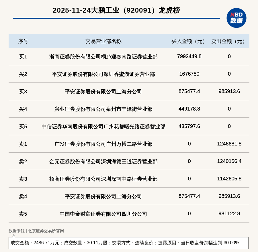 北交所上市公司大鹏工业登龙虎榜:当日收盘价跌幅达到-30.00%