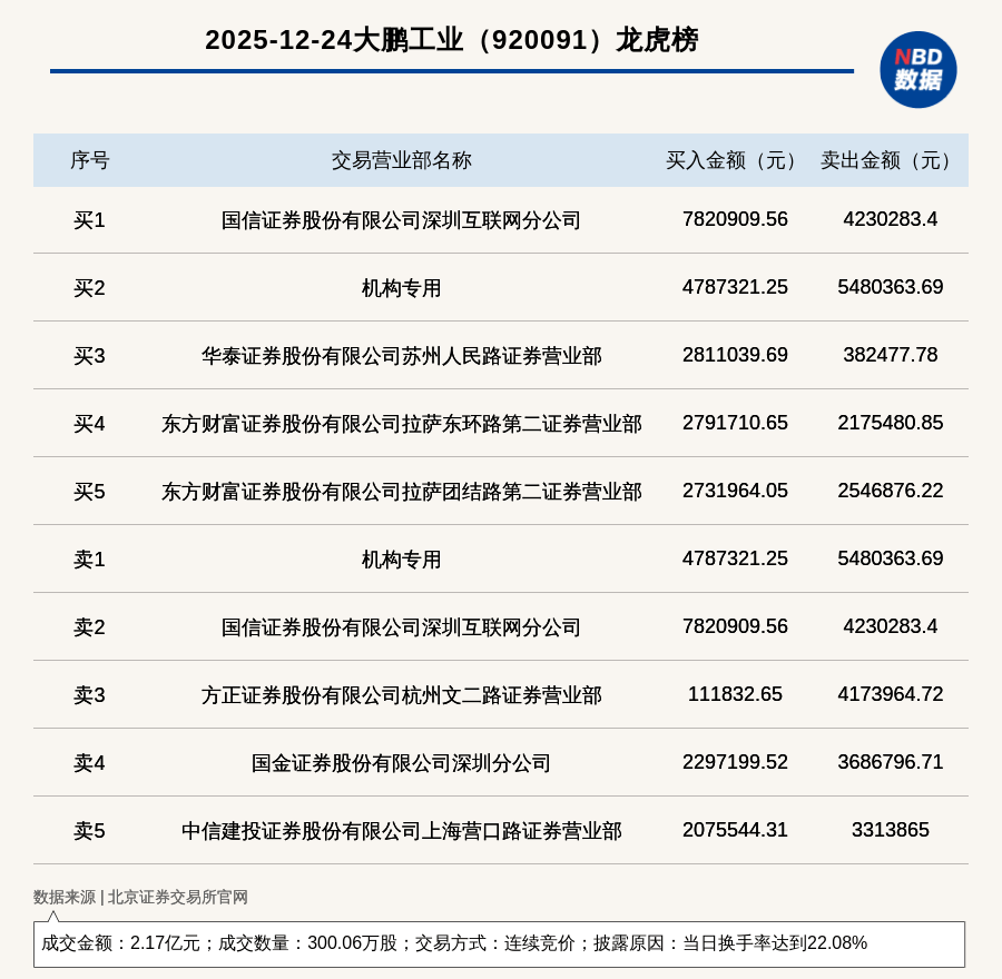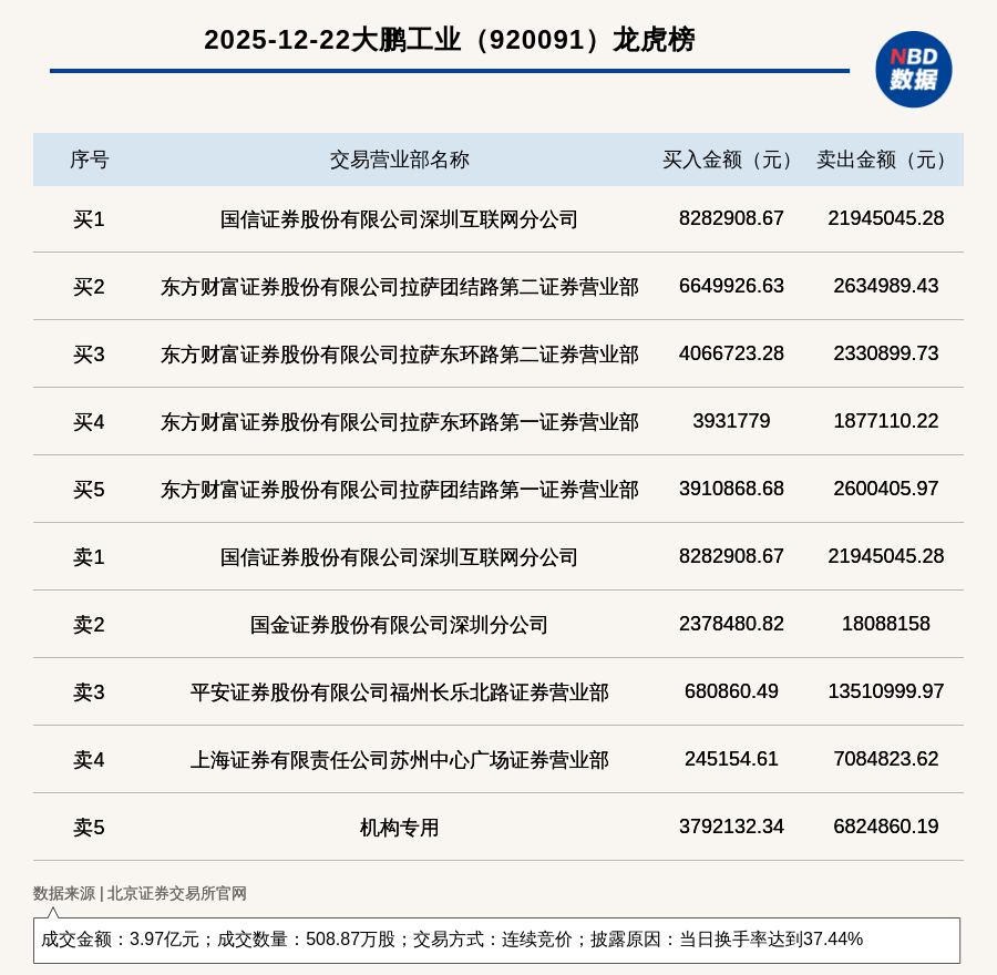 龙虎榜交易概况 - 2025年12月22日,北交所上市公司大鹏工业因当日换手率达到37.44%登上龙虎榜,交易方式为连续竞价 [1] - 当日成交数量为508.87万股,成交金额为3.97亿元 [1] 买卖席位与资金流向 - 买入金额排名第一的席位为国信证券股份有限公司深圳互联网分公司,买入828.29万元 [1][2] - 卖出金额排名第一的席位同样为国信证券股份有限公司深圳互联网分公司,卖出2194.5万元 [1][2] - 卖出金额排名第二的席位为国金证券股份有限公司深圳分公司,卖出1808.82万元 [2] - 卖出金额排名第三的席位为平安证券股份有限公司福州长乐北路证券营业部,卖出1351.10万元 [2] - 机构专用席位当日买入379.21万元,卖出682.49万元 [2] - 东方财富证券股份有限公司旗下多个拉萨营业部(团结路第二、东环路第二、东环路第一、团结路第一)出现在买方前列,合计买入金额超过1855.93万元 [2]