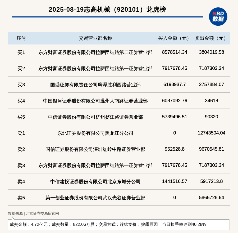 (记者 胡玲) 免责声明:本文内容与数据仅供参考,不构成投资建议,使用前核实。据此操作,风险自担。 每经讯,2025年8月19日,北交所上市公司志高机械(920101,收盘价:56.05元)登上龙虎榜,交易方式是连续竞价,披露原因 是当日换手率达到40.28%,成交数量822.06万股,成交金额4.72亿元。买一席位为东方财富证券股份有限公司拉萨团结路第二证 券营业部,买入857.85万元;卖一席位为东北证券股份有限公司黑龙江分公司,卖出1274.35万元。 | | 2025-08-19志高机械 (920101) 龙虎榜 | | | | --- | --- | --- | --- | | 序号 | 交易营业部名称 | 买入金额(元) | 卖出金额(元) | | ਜੇਟ ਹ | 东方财富证券股份有限公司拉萨团结路第二证券营业部 | 8578514.34 | 3804019.58 | | ポン | 东方财富证券股份有限公司拉萨团结路第一 证券营业部 | 7917678.45 | 7187303.34 | | ऋ३ | 国盛证券有限责任公司鹰潭胜利西路营业部 | 6198937.7 | 2757884.07 | | ...