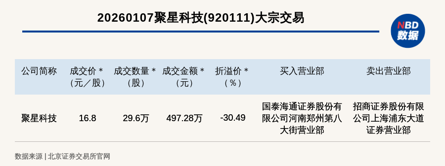 每经讯,2026年1月7日,北交所上市公司聚星科技(920111,收盘价:24.17元)发生一笔大宗交易,成交价16.8元/股,成交数 量29.6万股,成交金额497.28万元,折价30.49%。买入营业部是国泰海通证券股份有限公司河南郑州第八大街营业部,卖出营业 部是招商证券股份有限公司上海浦东大道证券营业部。 免责声明:本文内容与数据仅供参考,不构成投资建议,使用前核实。据此操作,风险自担。 每日经济新闻 (记者 曾健辉) ...