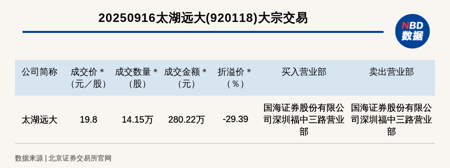 大宗交易详情 - 成交价格20.2元/股,较当日收盘价28.53元折价29.2% [1] - 成交量9.3万股,成交总额187.86万元 [1] - 买方为东方财富证券拉萨团结路第一证券营业部,卖方为招商证券湖州苕溪西路证券营业部 [1] 公司基本信息 - 公司为北交所上市公司太湖远大,证券代码920118 [1] - 2025年9月9日发生大宗交易,当日收盘价为28.53元 [1]