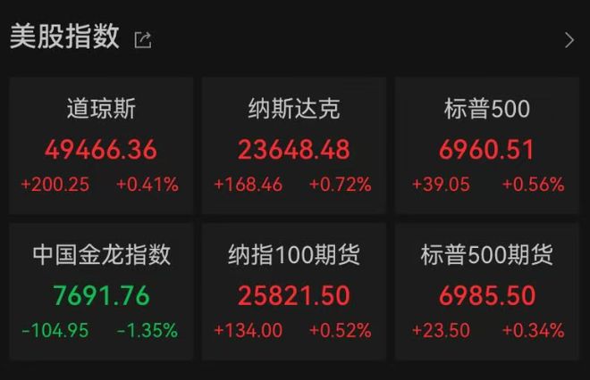 美股市场表现 - 美股三大指数于1月9日晚集体高开,截至北京时间10日凌晨0:15,道琼斯指数涨0.41%,标普500指数涨0.56%,纳斯达克综合指数涨0.72% [1] - 具体指数点位及涨幅为:道琼斯指数报49466.36点,涨200.25点或0.41%;纳斯达克综合指数报23648.48点,涨168.46点或0.72%;标普500指数报6960.51点,涨39.05点或0.56% [2] - 纳斯达克中国金龙指数下跌104.95点或1.35%,报7691.76点 [2] 大型科技股与芯片股 - 大型科技股涨跌不一,英特尔股价表现突出,涨8.29%至44.520美元,创2024年4月份以来盘中新高 [2][3] - 其他大型科技股中,谷歌-C涨0.99%,特斯拉涨0.54%,脸书涨0.01%;而苹果跌0.26%,英伟达跌0.26%,微软跌0.83%,亚马逊跌1.24% [3] - 芯片股普遍上涨,费城半导体指数涨超2%,阿斯麦涨超5%,美光科技涨超3% [2] 中概股表现 - 中概股整体下挫,纳斯达克中国金龙指数跌近1.4% [3] - 个股方面,阿里巴巴、满帮集团、小鹏汽车跌超3%,唯品会、理想汽车跌超2% [3] 黄金市场动态 - 国际黄金价格短线拉升,现货黄金涨0.6%,报4504.76美元/盎司 [4] - 国内金饰品牌报价再次接近1400元/克,周生生足金饰品克价为1392元/克,较1月5日的1376元/克上涨16元/克;周大福、潮宏基、谢瑞麟报价均为1392元/克 [9] - 周生生天猫旗舰店一款黄金生生有喜系列珍珠四叶草项链价格从120800元上调至136000元,一夜之间上涨15200元,券后价为135940元 [4][7] 其他贵金属与能源 - 现货白银大涨3.88%,报79.88美元/盎司;COMEX期货白银大涨6.66% [9] - 国际油价拉升,WTI原油涨2.94%,报59.46美元/桶;布伦特原油涨2.56%,报63.58美元/桶 [10]