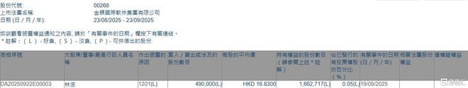 金蝶国际(00268.HK)遭执行董事林波减持49万股