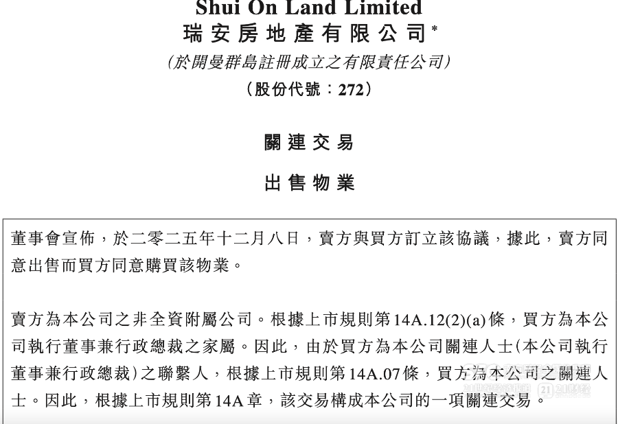 瑞安地产约3000万元出售上海豪宅给高管家属