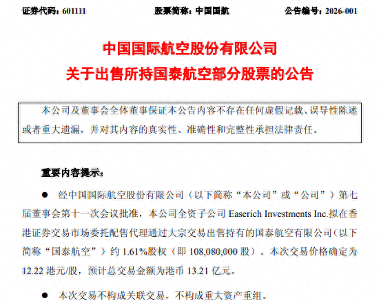中国国航减持国泰航空股份交易 - 中国国航于1月6日宣布通过全资子公司出售国泰航空约1.61%股权,即1.08亿股,交易价格为每股12.22港元,总交易金额为13.21亿港元 [1] - 此次交易价格较国泰航空1月5日收盘价13.09港元折价超过6%,但与账面值相比溢价约18.03%,预计为公司创造税前利润约1.82亿元 [1] - 交易完成后,中国国航强调其仍为国泰航空重要战略股东,支持不变,且交易不会对公司未来财务状况和经营成果造成重大影响 [1] 双方历史股权关系 - 中国国航与国泰航空的交叉持股始于2006年6月,中国国航在2009年及2020年实施增持,截至2025年半年报,其初始投资成本超过142亿元 [2] - 在此次减持前,中国国航持有国泰航空约28.72%的股份,而国泰航空持有中国国航15.09%的股份 [2] 股权结构变动与要约门槛 - 国泰航空正处于股权架构调整阶段,去年11月宣布将回购第三大股东卡塔尔航空持有的全部股份,交易总价达69.69亿港元 [3] - 卡塔尔航空股份回购完成后,中国国航对国泰航空的持股比例将从28.74%提升至31.78%,这将触发持股30%须发出全面要约的规定 [3] - 若将国泰航空的回购与中国国航本次减持计划叠加,全部完成后中国国航的持股比例将降至29.98%,低于全面要约触发门槛,同时太古公司已提交强制要约豁免申请 [3] 航空行业市场前景 - 国泰航空当前股价处于2019年下半年以来的最高位,自去年10月底以来累计涨幅已超过20% [4] - 行业客座率已攀升至历史高位,2025年9月中旬以来票价整体同比转正,华创证券预计2026年行业需求增速或可达5%以上,供给增速预计低于需求,客座率可能进一步攀升并引发高价格弹性 [4]