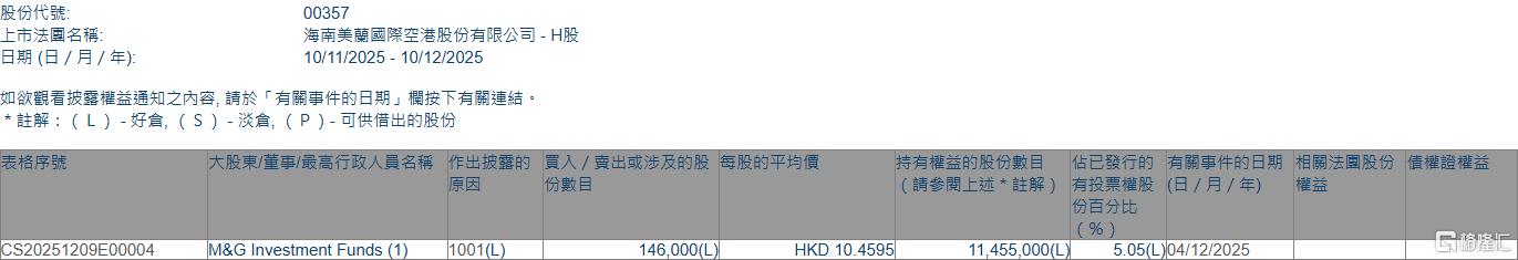 美兰空港(00357.HK)获M&G Investment Funds (1)增持14.6万股