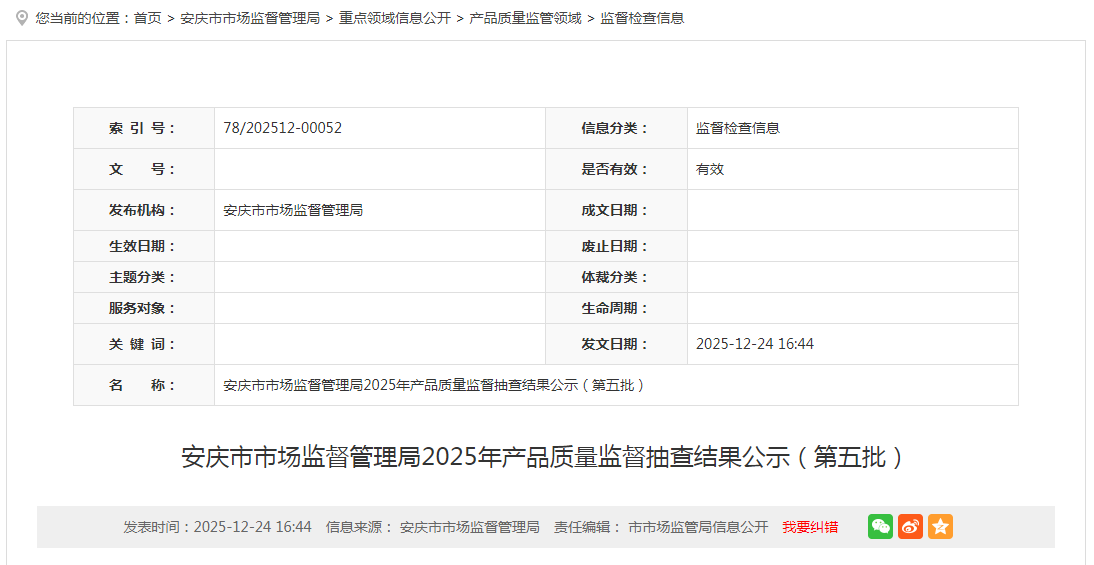 安徽省安庆市市场监督管理局公示2025年产品质量监督抽查结果(第五批)