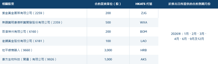 香港交易所推出新股票期权 - 香港交易所将于2026年1月19日推出六只新的股票期权类别,以拓展市场并为投资者提供更丰富的选择 [2] - 新增期权涉及的股票包括紫金黄金国际(02259)、药明康德(02359)、百济神州(06160)、老铺黄金(06181)、地平线机器人(09660)及康方生物(09926) [2] 衍生产品市场交易表现 - 香港交易所衍生产品市场去年的日均成交量为1,662,751张合约,同比上升7%并创纪录新高 [2] - 其中,股票期权(包括每月及每周到期合约)是交投最活跃的产品之一,去年日均成交量达879,831张合约,同比增加22%,同样创出纪录新高 [2] 新期权合约具体条款 - 紫金黄金国际(02259)期权合约买卖单位为200股,HKATS代码为ZJG [3] - 药明康德(02359)期权合约买卖单位为500股,HKATS代码为WXA [3] - 百济神州(06160)期权合约买卖单位为200股,HKATS代码为BOM,推出日提供的合约到期月份包括2026年1月、2月、3月、4月、6月、9月及12月 [3] - 老铺黄金(06181)期权合约买卖单位为100股,HKATS代码为LAO [3] - 地平线机器人(09660)期权合约买卖单位为3,000股,HKATS代码为HRB [3] - 康方生物(09926)期权合约买卖单位为1,000股,HKATS代码为AKS [3]