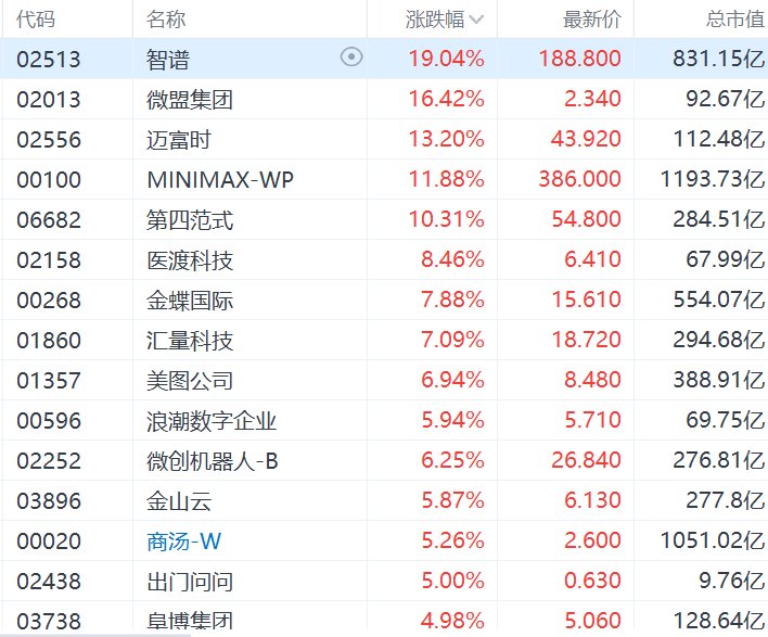 港股频道更多独家策划、专家专栏,免费查阅>> 责任编辑:栎树 格隆汇1月12日|港股市场AI应用股集体飙升,其中,智谱涨19%创上市新高,微盟集团涨超16%,迈 富时涨超13%,MINIMAX-WP涨超11%创上市新高,第四范式涨超10%,医渡科技涨超8%,金蝶国 际、汇量科技涨超7%,美图公司、微创机器人-B涨超6%,浪潮数字企业、金山云、商汤-W、出门问问 涨超5%。 | 代码 | 名称 | | 涨跌幅 √ | 最新价 | 总市值 | | --- | --- | --- | --- | --- | --- | | 02513 | 智谱 | 0 | 19.04% | 188.800 | 831.15亿 | | 02013 | 微體集团 | | 16.42% | 2.340 | 92.67 亿 | | 02556 | 迈富时 | | 13.20% | 43.920 | 112.48亿 | | 00100 | MINIMAX-WP | | 11.88% | 386.000 | 1193.73亿 | | 06682 | 第四范式 | | 10.31% | 54.800 | 284.51亿 | | 02158 | ...