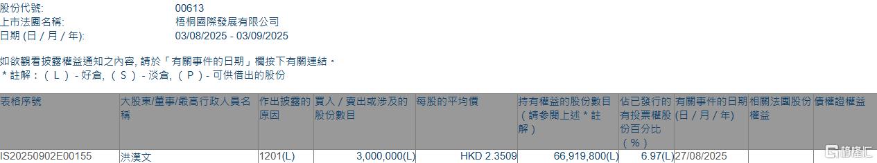 梧桐国际(00613.HK)遭股东洪汉文减持300万股
