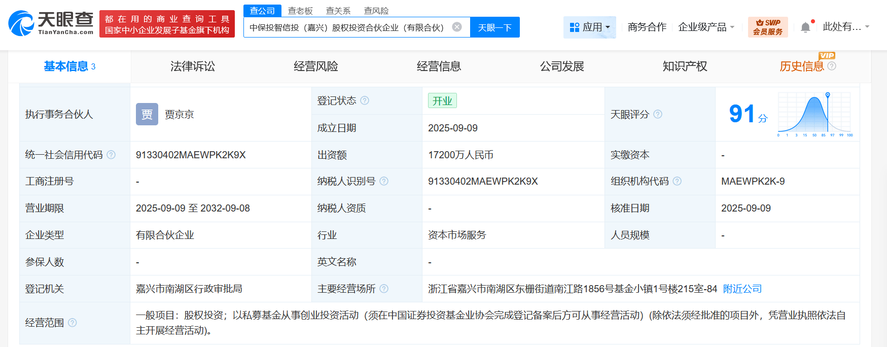 公司基本信息 - 公司名称为中保投智信投(嘉兴)股权投资合伙企业(有限合伙)[1] - 执行事务合伙人为贾京京[1][2] - 注册资本达1.72亿元人民币(17200万人民币)[1][2] - 成立日期为2025年9月9日[2] - 企业类型为有限合伙企业[2] - 主要业务聚焦于股权投资及通过私募基金形式开展创业投资活动[1][2] 股东背景与合伙人构成 - 复星国际(00656.HK)通过旗下上海复星高科技(集团)有限公司参与出资[2] - 国信资本有限责任公司作为重要合伙人加入[2] - 中保投资有限责任公司作为重要合伙人加入[2] 行业定位与业务方向 - 行业属于资本市场服务[2] - 通过私募基金形式开展创业投资活动[1][2] - 依托股东方的产业资源与金融优势在股权投资领域展开全面布局[5] 市场影响与前景 - 三家不同背景的企业联手成立股权投资合伙企业体现资本运作层面的深度合作[3] - 为创业投资市场带来新的活力[3] - 有助于精准对接优质项目推动创新型企业发展[3] - 为投资人创造更多价值回报[3] - 随着创业投资市场持续升温有望成为行业重要力量[5]