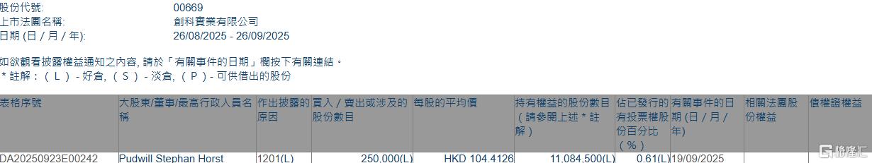 Pudwill Stephan Horst减持创科实业(00669)25万股 每股作价约104...