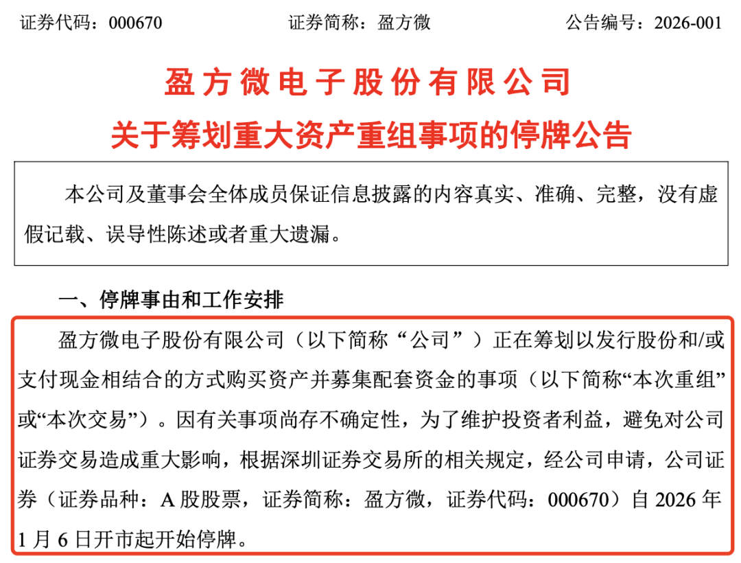 盈方微重大资产重组 - 公司正在筹划以发行股份和/或支付现金方式,购买上海肖克利信息科技股份有限公司、FIRST TECHNOLOGY CHINA LIMITED(富士德中国有限公司)、时擎智能科技(上海)有限公司的控股权,预计构成重大资产重组 [1][2][5] - 公司股票自2026年1月6日开市起停牌,预计在不超过10个交易日内(即1月20日前)披露交易方案,否则将复牌并承诺至少1个月内不再筹划重组 [2][5] - 截至1月5日收盘,公司股价大涨4.74%,报7.73元,总市值为65.28亿元 [6] - 公司主营业务为电子元器件分销和集成电路芯片的研发、设计和销售,主要产品包括射频芯片、指纹芯片、电源芯片、存储芯片等 [6] 威高血净重大资产重组 - 公司拟发行股份购买山东威高普瑞医药包装有限公司100%股权,交易价格为85.11亿元,构成重大资产重组及关联交易 [1][7][8] - 交易对方为威高股份、威海盛熙和威海瑞明,交易完成后威高股份及其一致行动人合计持股比例将提升至84.36%,控制权未发生变化 [7][8] - 标的公司威高普瑞成立于2018年9月13日,注册资本1.06亿元,主营业务为预灌封给药系统及自动安全给药系统等医药包材的研发、生产与销售 [8][9] - 本次交易前,公司主营业务为血液净化领域医用制品的研发、生产和销售;交易后将新增医药包材业务,旨在整合技术积累与产品布局,扩展产品线 [9] 威高血净公司背景与市场地位 - 公司于2025年5月19日在上海证券交易所主板上市,截至1月5日收盘,股价大涨4.69%,总市值达173.33亿元 [9] - 公司产品覆盖血液透析器、血液透析管路、血液透析机、腹膜透析液等,2023年其在国内血液透析器、血液透析管路领域的市场占比分别为32.5%和31.8%,均位居行业第一 [9] - 公司已基于自身技术平台完成中空纤维病毒过滤器等生物制药滤器的技术研发与产品试制,交易后计划协同标的公司的客户资源,共同开拓生物制药滤器市场 [9][10]