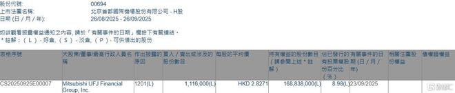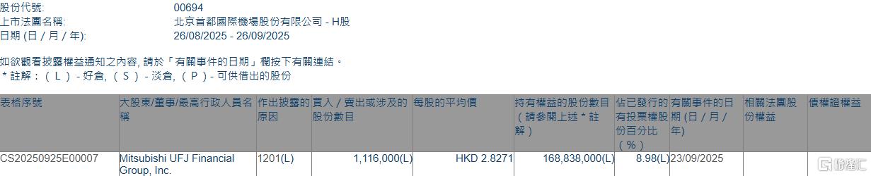 北京首都机场股份(00694.HK)遭Mitsubishi UFJ Financial Gro...