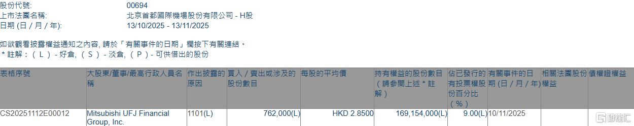 Mitsubishi UFJ Financial Group, Inc.增持北京首都机场76.2万股 每股作价2.85港元
