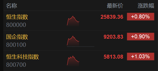 港股市场表现 - 恒生指数上涨0.80%至25839.36点 盘中突破26000点创近4年新高 [1] - 国企指数上涨0.90%至9203.83点 站上9200点关口 [1] - 恒生科技指数上涨1.03%至5813.08点 刷新阶段新高 [1] 板块表现 - 大型科技股表现活跃 京东和阿里巴巴上涨约3% [3] - 大金融板块普遍上涨 银行保险券商等权重股活跃 [3] - 内险股由云锋金融领涨 中信证券中国银河工商银行等多股涨超1% [3] - 黄金股大涨领衔有色金属板块 招金矿业灵宝黄金紫金矿业山东黄金均创历史新高 [3] - 内房股大幅拉升 碧桂园涨27.45%世茂集团涨19.67%融信中国涨9.38%雅居乐集团涨8.51%中国金茂涨6.85%龙湖集团涨6.16% [2][3] - 新消费概念股钢铁股体育用品股互联网医疗股稳定币概念股纷纷上涨 [3] 弱势板块 - 稀土概念股走低 [3] - 苹果概念股影视娱乐股餐饮股生物医药股石油股普遍弱势 [3] - 通达集团跌近9% 百胜中国九毛九海底捞均有跌幅 [3] 政策影响 - 一线城市优化限购政策落地助推内房股上涨 [3] - 全球宽松政策及反内卷措施助攻黄金及有色金属板块 [3]
