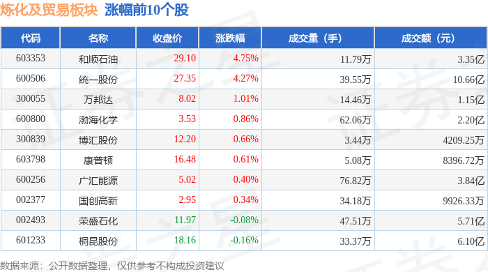 | 代码 | 名称 | 收盘价 | 涨跌幅 | 成交量(手) | 成交额(元) | | | --- | --- | --- | --- | --- | --- | --- | | 603353 | 和顺石油 | 29.10 | 4.75% | 11.79万 | | 3.35 Z | | 600506 | 统一股份 | 27.35 | 4.27% | 39.55万 | | 10.66亿 | | 300055 | 万邦达 | 8.02 | 1.01% | 14.46万 | | 1.15亿 | | 600800 | 渤海化学 | 3.53 | 0.86% | 62.06万 | | 2.20亿 | | 300839 | 博汇股份 | 12.20 | 0.66% | 3.44万 | | 4209.25万 | | 603798 | 康普顿 | 16.48 | 0.61% | 5.08万 | | 8396.72万 | | 600256 | 广汇能源 | 5.02 | 0.40% | 76.82万 | | 3.84亿 | | 002377 | 国创高新 | 2.95 | 0.34% | 34.18万 | | 9926.33万 ...