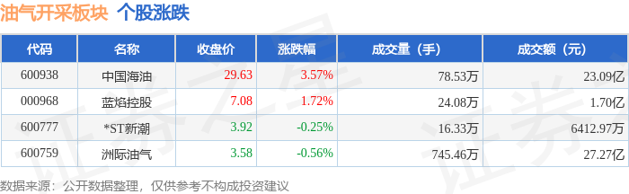 | 代码 | 名称 | | | 主力净流入(元) 主力净占比 游资净流入(元) 游资净占比 散户净流入 (元) 散户净占比 | | | | | --- | --- | --- | --- | --- | --- | --- | --- | | 600938 中国海油 | | 1.91亿 | 8.28% | -3867.24万 | -1.68% | -1.53 Z | -6.61% | | 000968 蓝焰控股 | | 975.19万 | 5.73% | -460.92万 | -2.71% | -514.27万 | -3.02% | | 600777 | *ST新潮 | -892.77万 | -13.92% | 512.68万 | 7.99% | 380.08万 | 5.93% | | 600759 洲际油气 | | -1.75 Z | -6.41% | 4029.54万 | 1.48% | 1.35 Z | 4.93% | 证券之星消息,1月13日油气开采板块较上一交易日上涨2.28%,中国海油领涨。当日上证指数报收于 4138.76,下跌0.64%。深证成指报收于14169.4,下跌1.37%。油气开采板 ...