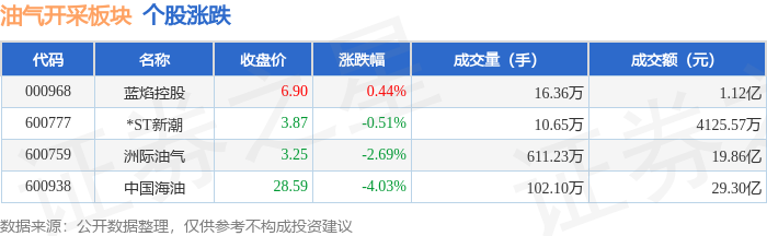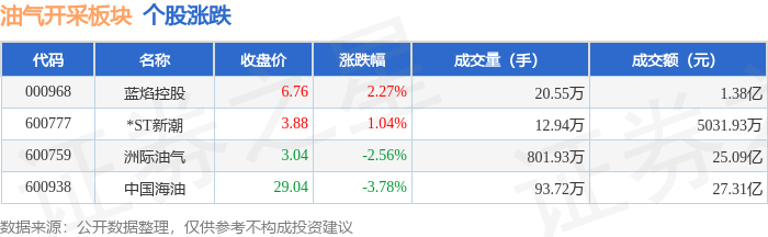 证券之星消息,1月7日油气开采板块较上一交易日下跌3.02%,中国海油领跌。当日上证指数报收于 4085.77,上涨0.05%。深证成指报收于14030.56,上涨0.06%。油气开采板块个股涨跌见下表: | 代码 | 名称 | 收盘价 | 涨跌幅 | 成交量(手) | 成交额(元) | | --- | --- | --- | --- | --- | --- | | 000968 | 蓝焰控股 | 6.90 | 0.44% | 16.36万 | 1.12亿 | | 600777 | *ST新潮 | 3.87 | -0.51% | 10.65万 | 4125.57万 | | 600759 | 洲际油气 | 3.25 | -2.69% | 611.23万 | 19.86 Z | | 600938 | 與奧圖于 | 66'86 | -4.03% | 102.10万 | 29.30亿 | 从资金流向上来看,当日油气开采板块主力资金净流出5.71亿元,游资资金净流入2.04亿元,散户资金净 流入3.67亿元。油气开采板块个股资金流向见下表: | 代码 | 名称 | 主力净流入 (元) | | | 主力净占比 游资净流入 ...