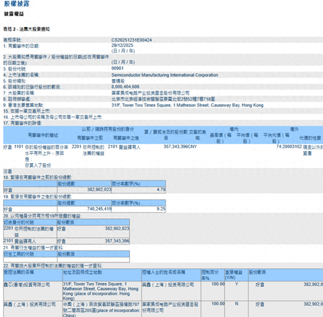格隆汇1月5日|中芯国际AH股齐涨,其中,A股涨近6%报129.94元,H股一度涨超4%报78.3港元,均 创逾2个月新高。消息面上,港交所权益披露,中芯获被称为"国家大基金"的国家集成电路产业投资基 金,于去年12月29日以每股平均价74.2元人民币,增持逾3.57亿股,涉资约265.15亿元人民币。"国家大 基金"持有中芯股权由4.79%增加至9.25%,超过5%持股披露门槛。 ...