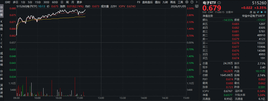 今日(1月5日)市场涨势红火,电子板块涨幅居前!截至发稿,电子板块获主力资金净流入268亿元, 板块吸金额高居31个申万一级行业首位!热门ETF方面,荟聚电子板块核心龙头的电子ETF(515260) 场内价格当前大涨3.35%,场内频现溢价区间,显示买盘资金更为强势,或有资金进场布局! | | | 分时 部日 1分 5分 15分 30分 60分 日 周 月 霞多 | | | | F9 盘机盘版 盘加 九种 图线 工具 @ O > | | 电子ETF O | | 515260 | | --- | --- | --- | --- | --- | --- | --- | --- | --- | --- | --- | | | | 51526000/FCTF) 10:13 � 0.675 落原 0.018(2.74%) 约翰 0.673 版交量 2291 IOPV 0.6748 | | | | | 2026/01/05 = | 0.679 | | +0.022 +3.35% | | | | | | | | | | SSE CNY 11:00:15 页面中 | | 用用元素液 | | | | --- | | | | | ...