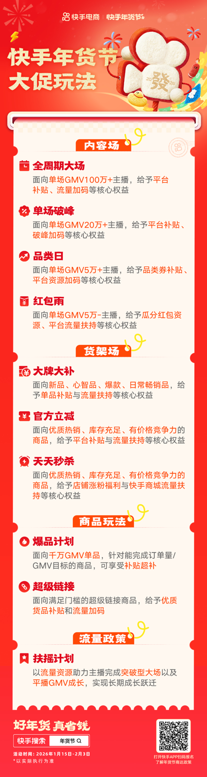 2026快手年货节战略与资源配置 - 2026年快手年货节已进入关键筹备期,预售开启,主题为“好年货 真省钱”[1] - 年货节是全年最重要的大促节点之一,平台将通过内容场与货架场双线发力,叠加全域流量扶持与爆品激励机制,为商家与达人打造全域增长通路[1] - 快手电商将从内容场玩法、货架场玩法、流量扶持机制、商品激励政策等维度同步释放资源,帮助商家与主播完成从“做声量”到“跑规模”的跃迁[1] 内容场运营策略 - 内容场是年货节最重要的需求发动机,平台将根据主播与商家的历史成交能力分层开放参与门槛[4] - **全周期大场激励**:面向近一年单场成交能力在100万以上的主播与品牌商家,围绕年货节全周期大场增量给予C补激励,支持规模型爆发[4] - **单场破峰激励**:面向近一年单场成交能力在20万级以上的主播与品牌商家,鼓励冲刺破峰大场,按增量GMV给予C补激励,首次实现跃迁门槛的商达还可获得额外跃迁奖励[4] - **主题品类日大场**:面向近一年单场成交能力在5万以上的主播与品牌商家,围绕新年刚需场景与趋势类目做主题大场,参与即可按增量获得激励[4] - **红包雨扶持**:面向近一年单场风控后GMV成交能力在1到5万的商达,开播即可参与红包雨瓜分,帮助新主播完成冷启动与首轮转化[4] 货架场运营策略 - 货架场已成为商家在年货节实现生意爆发的必争之地,承接用户的确定性需求并消化内容长尾流量[5] - **大牌大补**:通过大牌商品官方补贴和专属频道入口承接用户购物需求,报名审核通过的商品将获得商城首页固定频道曝光、货架流量加权、站外推广、专属补贴与商详氛围资源[6] - **官方立减**:年货节全周期88折官方立减,叠加平台补贴,单件商品低至7.5折,审核通过的商品将获得更高流量倾向,提升转化效率[6] - **天天秒杀**:通过平台级秒杀场,给予参与商品强曝光与涨粉承接,帮助商家获得销量爆发并同步沉淀私域粉丝资产[6] 商品激励与爆品政策 - “爆品”成为平台重点扶持方向之一,爆品计划与超级链接是助推单品打爆的专属激励政策[7] - **爆品计划**:聚焦用户高需求商品品类,面向千万GMV单品,帮助具备转化能力与内容基础的商品享受阶梯补贴、达人分销支持与货盘流量加权,完成从“跑得动”到“跑得大”的升级[7] - **超级链接**:由平台生成商品链接,商家供货和履约,平台给予优质货品补贴和流量加码,提升转化力[7] - 超级链接面向年货礼盒、生鲜水果、应季保暖、3C家电、酒水民生等核心年货场景,提供全域生效的超级商品承接能力,让好商品在内容场、货架场同时爆发[7] 流量扶持与生态建设 - 平台推出**扶摇计划**,针对商达设计通过“做大场,带平播”的成长机制,助力主播完成突破型大场,进而带动大场后的平播GMV成长,实现跃迁[7] - 快手电商已于杭州举办2026快手年货节·超级双选会,超千位商家达人现场参与选品与货盘撮合,为年货节期间的直播大场、爆品打造和商城规模成交提前打好基础[7]