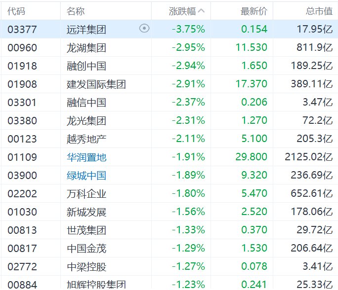 | 代码 | 名称 | | 涨跌幅 ^ | 最新价 | 总市值 | | --- | --- | --- | --- | --- | --- | | 03377 | 元洋集团 | (0) | -3.75% | 0.154 | 17.95亿 | | 00960 | 龙湖集团 | | -2.95% | 11.530 | 811.9亿 | | 01918 | 融创中国 | | -2.94% | 1.650 | 189.25亿 | | 01908 | 建发国际集团 | | -2.91% | 17.370 | 389.11亿 | | 03301 | 融信中国 | | -2.37% | 0.206 | 3.47 乙 | | 03380 | 龙光集团 | | -2.31% | 1.270 | 72.2亿 | | 00123 | 越秀地产 | | -2.11% | 5.100 | 205.3亿 | | 01109 | 华润置城 | | -1.91% | 29.800 | 2125.02亿 | | 03900 | 绿城中国 | | -1.89% | 9.320 | 236.69亿 | | 02202 | 万科企业 | | -1. ...