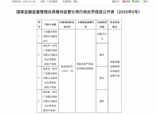 据惠银罚决字〔2025〕5号,因贷款业务严重违反审慎经营规则,国家金融监督管理总局惠州监管分局 对广发银行股份有限公司惠州分行处以罚款20万元,对时任广发银行股份有限公司惠州分行零售信贷客 户经理的侯志华、陈育青、桂若新处以警告。 12月9日,国家金融监督管理总局广东监管局披露一则行政处罚信息,广发银行股份有限公司惠州分行 被处以罚款20万元,三名客户经理被处以警告。 采写:南都N视频记者 吴方 | 序 | 当事人名称 | 行政处罚决定 | 主要违法违规行 | 行政处罚 | 作出决定 | | --- | --- | --- | --- | --- | --- | | 号 | | 书文号 | 为 | 内容 | 机关 | | 1 | 广发银行股份 有限公司惠州 | | | 罚款20万 元 | | | | 分行 | | | | | | 2 | 侯志华(时任 广发银行股份 有限公司惠州 | | | 整告 | | | | 分行零售信 | | 贷款业务严重违 | | 国家金融 | | | 贷客户经理 | 惠金罚决字 | | | 监督管理 | | | 陈育青(时任 | [2025] 5号 | 反审慎经营规则 | | | | ...