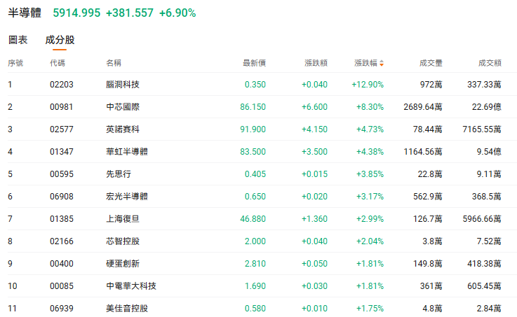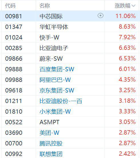 | 代码 | 名称 | 涨跌幅 √ | | --- | --- | --- | | 00981 | 中古国际 | 11.06% | | 01347 | 华虹半导体 | 8.63% | | 01024 | 快手-W | 7.92% | | 00285 | 比亚迪电子 | 6.63% | | 09866 | 蔚来-SW | 6.53% | | 09888 | 百度集团-SW | 6.01% | | 09988 | 阿里巴巴-W | 4.35% | | 09618 | 京东集团-SW | 3.25% | | 01211 | 比亚迪股份 -- 百 | 3.18% | | 01810 | 小米集团-W | 3.33% | | 00522 | ASMPT | 3.05% | | 03690 | 美团-W | 2.87% | | 00700 | 腾讯控股 | 2.87% | | 00992 | 联想集团 | 2.42% | 来源:格隆汇APP 格隆汇10月2日|港股主要指数午后进一步拉升,其中,恒生科技指数涨近4%。成分股中,中芯国际涨 超11%,华虹半导体涨超8%,快手涨近8%,比亚迪电子、蔚来、百度涨超6%,阿里巴巴涨 ...