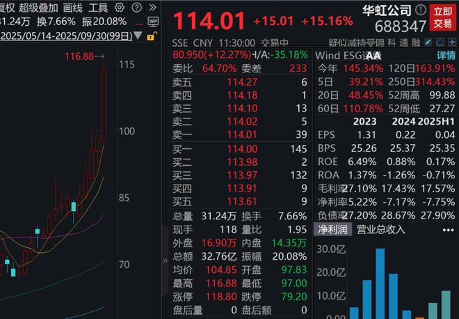 9月30日,华虹公司AH股齐涨,截至午间收盘,A股华虹公司涨超15%,股价一度升至116元/股,再创 历史新高,市值逼近2000亿元;截至发稿,港股华虹半导体涨超11%。 | 夏权 超级叠加 画线 工具 (2 >> | | | | | | 华虹公司 0 立即 | | --- | --- | --- | --- | --- | --- | --- | | 1.24万 换7.66% 振20.08% ... 图 2025/05/14-2025/09/30(99日)▼ | | | 114.01 +15.01 +15.16% | | 688347 交易 | | | | | SSE CNY 11:30:00 交易中 | | | FO V @ @ 女 勉強共製 好 好 ! | | | 116.88- | | | 80.950(+12.27%)H/A:-35.18% Wind ESG语级 | | 详情 | | | 115 | | 委比 64.70% 委差 | 233 | | 今年 145.34% 120日163.91% | | | | 可有 | 114.27 | 6 | 5日 | 39.21% 250日314.43% | | ...
