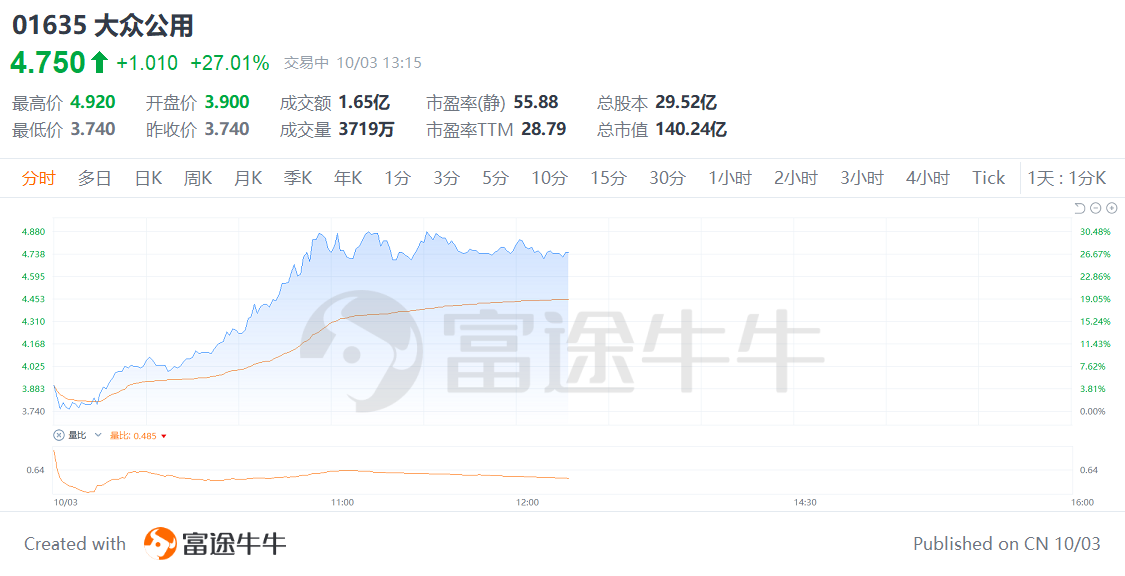 港股大众公用股价持续拉升,现涨超30%,续创新高