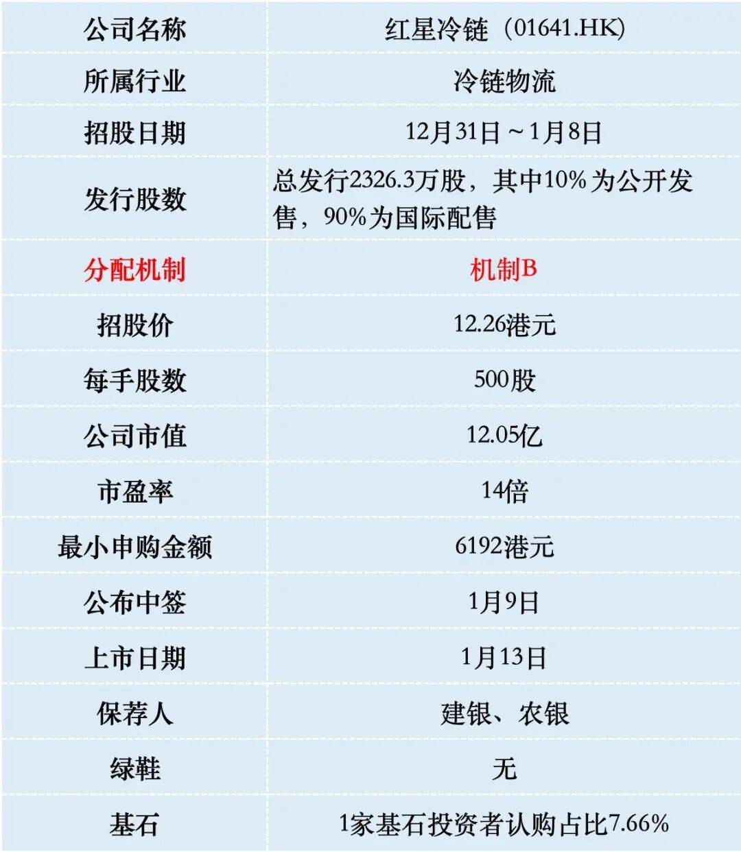 2025年,港交所通过IPO上市114家公司,创下近五年来港股IPO数量的新高,累计募资2858亿港元,位居全球交易所之首。 这标志着港股市场成功走出此前的低谷,实现了强劲复苏。相较于2023-2024年的低迷期,2025年的港股IPO市场展现出了世界级金融中心的韧性与活力。 目前仍有超过300家企业在港交所排队等待上市,市场储备项目充足。多家机构预测,在政策支持和全球资本关注下,2026年港股IPO市场的热度有望延 续,上市公司数量将超过120家,募资额或将进一步突破3000亿港元。 一、招股信息 | 公司名称 | 红星冷链(01641.HK) | | --- | --- | | 所属行业 | 冷链物流 | | 招股日期 | 12月31日~1月8日 | | 发行股数 | 总发行2326.3万股,其中10%为公开发 售,90%为国际配售 | | 分配机制 | 机制B | | 招股价 | 12.26港元 | | 每手股数 | 500股 | | 公司市值 | 12.05亿 | | 市盈率 | 14倍 | | 最小申购金额 | 6192港元 | | 公布中签 | 1月9日 | | 上市日期 | 1月13日 | | ...