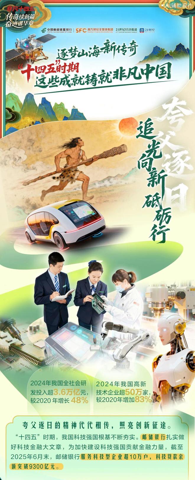 "十四五" 期间 中国"大国重器"不断上新 今年是"十四五"规划收官之年 制造转型升级加速推进 实体经济持续巩固壮大…… 我国在多个领域取得显著成就 而古老神话里的追梦精神 也在奋进的脚步中延续 一张长图 带您纵览 "十四五" 这五年的壮丽篇章 ↓↓↓ 2024年我国全社会研 发投入超3.6万亿元, 较2020年增长 48% 2024年我国高新 技术企业超50 厂家 较2020年增加83 夸 父 逐 日 的 精 神 代 代 相 传, 照 亮 创 新 征 途。 "十四五"时期,我国科技强国根基不断夯实。邮储银行扎实做 好科技金融大文章,为加快建设科技强国贡献金融力量,截至 2025年6月末,邮储银行服务科技型企业超10万户,科技贷款余 额突破9300亿元。 a "十四五"期间, 我国民营企业增加 到5800多万户, 目前国家高新技术 比"十三五"末增 长超过40% 企业中民营企业与 比达92%以上 精 卫 填 海 的 韧 劲 , 在 民 营 经 济 里 生 长 。 "十四五"时期,我国民营经济蓬勃发展,创新水平持续提升。 邮 储 银 行 以多元化金融服务赋能民营经济高质量发展,截至2025 年6月末,邮储银行民 ...