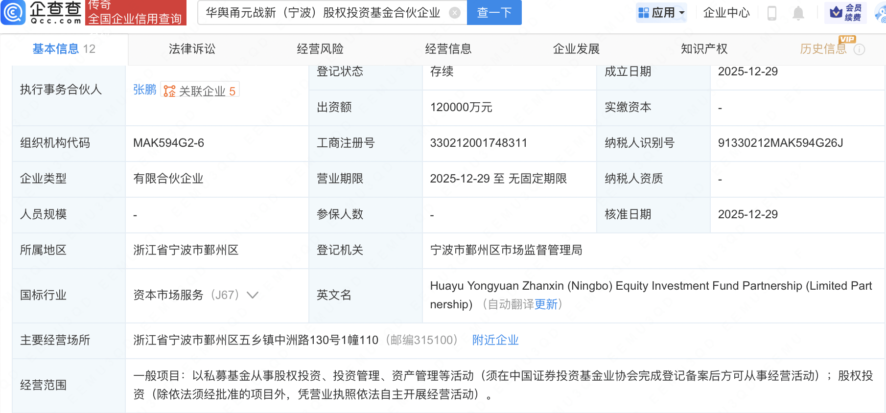 企查查APP显示,近日,华舆甬元战新(宁波)股权投资基金合伙企业(有限合伙)成立,出资额12亿元,经营范围包含:以私募基金从事股权投资、投资 管理、资产管理等活动。企查查股权穿透显示,该企业由中国中车(601766)全资子公司中车资本管理有限公司、宁波市甬元投资基金有限公司、宁波地铁 产业工程有限公司等共同出资。 | | | 传司 | 全国企业信用查询 | 华舆诵元战新(宁波)股权投资基金合伙企业 | × 查一下 | | --- | --- | --- | --- | --- | --- | | | 基本信息 12 | | 法律诉讼 | 经营风险 | 经营信息 | | 合伙人信息7 ① | | | 10 | | | | 序号 | | | 合伙人名称 | | 出资比例 ⇒ | | | | | 中车资本管理有限公司 国有企业 | | | | 1 | - - 级 股 东 | + | 中国中车股份有限公司 | | 100% | | 2 | + | 開元 财通 | 浙江勇元财通富浙高端装备产业股权投资合伙企业(有限合伙) | | | | | | | 国有企业 | | | | | | | 宁波市甬元投资基金有限公司 国有 ...