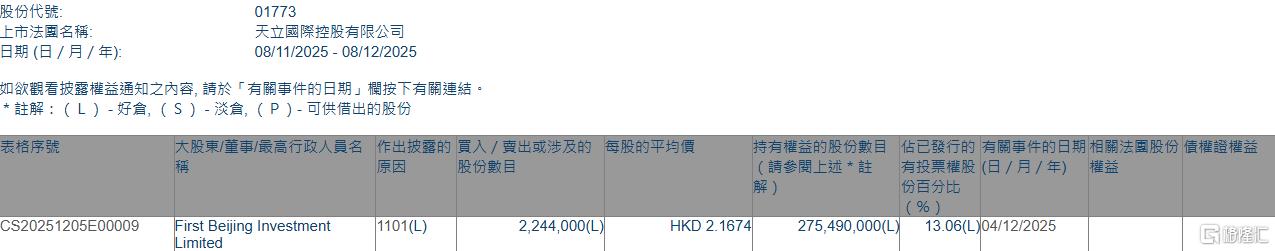 核心事件 - 2025年12月4日,First Beijing Investment Limited增持天立国际控股224.4万股,每股均价2.1674港元,涉资约486.36万港元 [1] - 增持后,该股东持股总数增至275,490,000股,持股比例由12.95%上升至13.06% [1] 股东权益变动详情 - 披露主体为First Beijing Investment Limited,股份代码01773,公司名称为天立国际控股有限公司 [2] - 权益披露期间为2025年11月8日至2025年12月8日,事件日期为2025年12月4日 [2] - 交易性质为场内买入(L),涉及股份数目2,244,000股 [2] - 交易完成后,该股东持有权益的股份数目为275,490,000股,占已发行有投票权股份的百分比为13.06% [2]