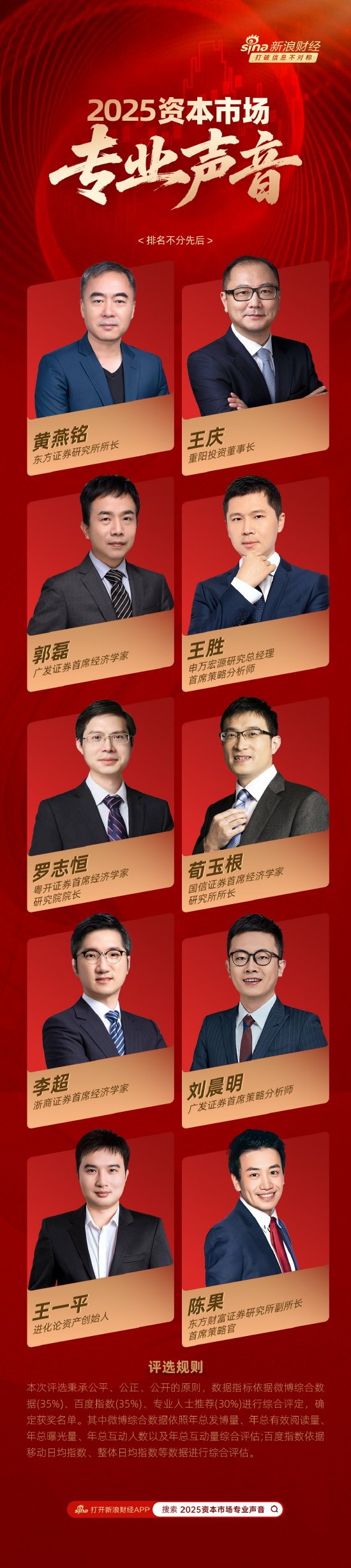 专题:专题:价值重估 行稳致远——年终盘点&2026资本市场展望 2025年12月31日——在信息纷繁、观点林立的资本市场中,理性、客观与深度的专业研究,始终是穿透 市场噪音、锚定长期价值的基石。今天,新浪财经正式发布 "2025资本市场专业声音" 榜单,聚焦那些 凭借扎实研究、审慎判断与清晰逻辑,持续为市场提供关键洞见与决策依据的顶尖研究领袖与资深投资 人。 以下为本次上榜人物(按姓名首字母排序): 陈果 东方财富证券研究所副所长、首席策略官 黄燕铭 东方证券研究所所长 李超 浙商证券首席经济学家 林园 林园投资董事长 刘晨明 广发证券首席策略分析师 罗志恒 粤开证券首席经济学家、研究院院长 王庆 重阳投资董事长 王胜 申万宏源研究总经理、首席策略分析师 王一平 进化论资产创始人 1. 微博综合数据(权重35%):依据年总发博量、年总有效阅读量、年总曝光量、年总互动人数及年 总互动量等多维度综合评估。 2.百度指数(权重35%):依据移动日均指数、整体日均指数等数据进行综合评估,反映其在全网的 持续关注度与影响力。 3.专业人士推荐(权重30%):广泛征询资深机构投资者、券商研究主管、金融媒体负责人及学术专 ...