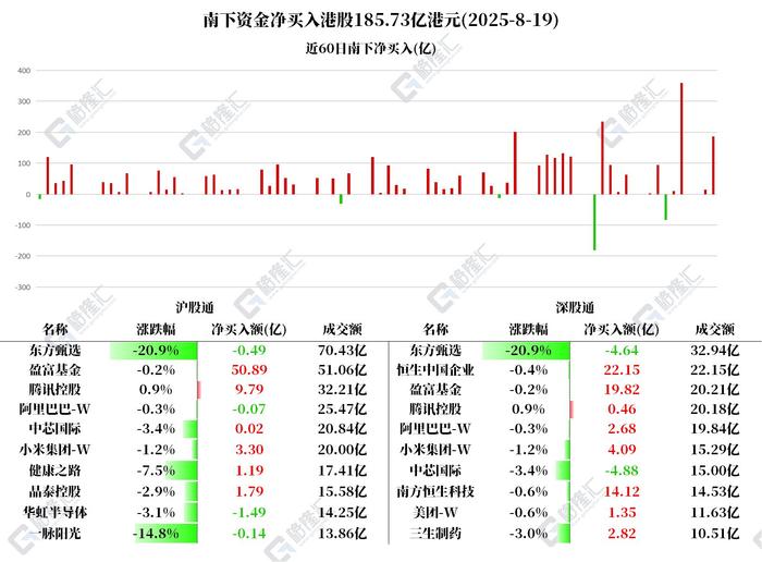 图解丨南下资金净买入港股185.7亿港元,加仓腾讯和小米,减仓东方甄选