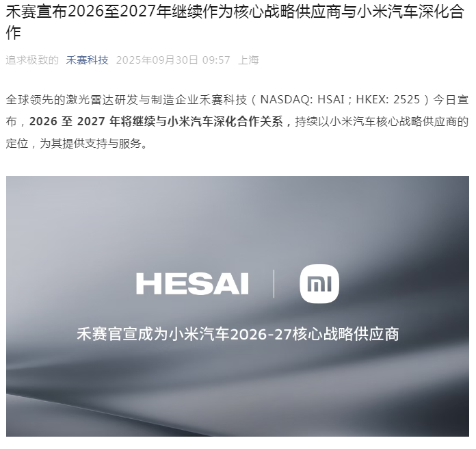 禾赛科技官宣与小米汽车深化合作,2026年-2027年继续供货