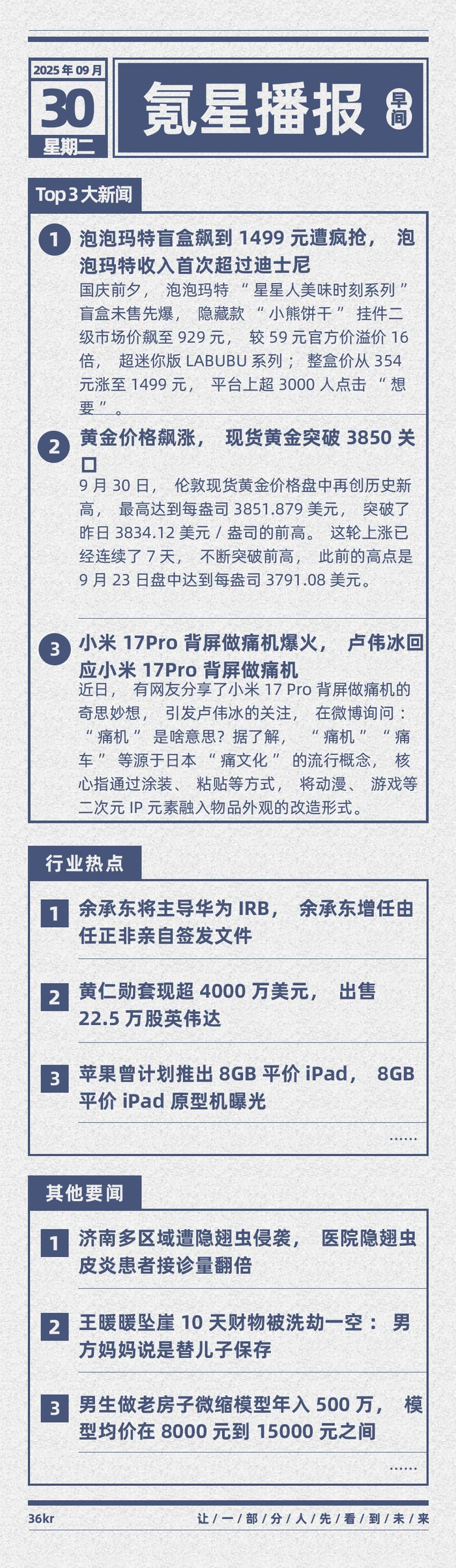 泡泡玛特 - 公司“星星人美味时刻系列”盲盒未售先爆,隐藏款“小熊饼干”挂件二级市场价格飙升至929元,较59元官方价溢价16倍 [4] - 超迷你版LABUBU系列整盒价格从354元涨至1499元,平台上超3000人点击“想要” [4] - 公司收入首次超过迪士尼 [1][4] 黄金市场 - 现货黄金价格于9月30日盘中再创历史新高,最高达到每盎司3851.879美元,突破前高3834.12美元/盎司 [3][4] - 此轮上涨已连续7天,不断突破前高,此前高点为9月23日盘中达到的每盎司3791.08美元 [4] 小米公司 - 小米17 Pro背屏“做痛机”概念在网络上爆火,引发公司高管卢伟冰在微博关注并询问“痛机”含义 [3][4] - “痛机”源于日本“痛文化”,核心是通过涂装、粘贴等方式将动漫、游戏等二次元IP元素融入物品外观 [4] 华为公司 - 余承东将主导华为IRB(投资评审委员会),其增任由任正非亲自签发文件 [3][5] 英伟达公司 - 公司首席执行官黄仁勋出售22.5万股英伟达股票,套现超4000万美元 [3][6] 苹果公司 - 公司曾计划推出8GB平价iPad,相关原型机已被曝光 [3][6] lululemon公司 - 公司出现2021年以来首次净利润下滑 [3] 特定商业模式 - 有从业者通过制作老房子微缩模型实现年收入500万元,模型均价在8000元到15000元之间 [3][6]