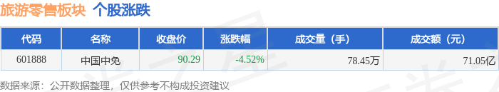 从资金流向上来看,当日旅游零售板块主力资金净流出2.91亿元,游资资金净流入7585.11万元,散户资 金净流入2.15亿元。旅游零售板块个股资金流向见下表: | 代码 名称 主力净流入 (元) 主力净占比 游资净流入 (元) 游资净占比 散户净占比 | | | | | | | --- | --- | --- | --- | --- | --- | | 601888 中国中免 | -2.9117 -5.59% | 7585.11万 | 1.46% | 2.15(Z | 4.13% | | WILL - A TT WILL CLASS | | | | | | 以上内容为证券之星据公开信息整理,由AI算法生成(网信算备310104345710301240019号),不构成投资建议。 证券之星消息,1月6日旅游零售板块较上一交易日上涨0.33%,中国中免领涨。当日上证指数报收于 4083.67,上涨1.5%。深证成指报收于14022.55,上涨1.4%。旅游零售板块个股涨跌见下表: | 代码 | 名称 | 收盘价 | 涨跌幅 | 成交量(手) | | 成交额(元) | | | --- | --- | --- | - ...