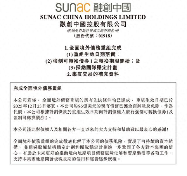 来源:环球网 【环球网综合报道】12月23日,融创中国控股有限公司(简称"融创中国")公告宣布,其全面境外债务 重组的所有先决条件均已达成,重组生效日期已于2025年12月23日落实。 公告披露,约96亿美元的现有债务已获全面解除及免除,作为代价,融创中国根据计划条款于重组生效 日期向计划债权人发行强制可转换债券1及强制可转换债券2。 融创中国称,对债权人及相关各方一直以来的大力支持和帮助致以最衷心的感谢。全面境外债务重组的 完成彻底化解了公司的债务风险,实现了可持续的资本结构,并通过股权结构稳定计划和团队稳定计划 进一步巩固了各方对集团的信心,有助于未来更好地推动境内地产项目债务风险化解和资产盘活等各项 工作,支持地产开发板块长期的信用和经营逐步恢复。 图源:融 创中国 ...